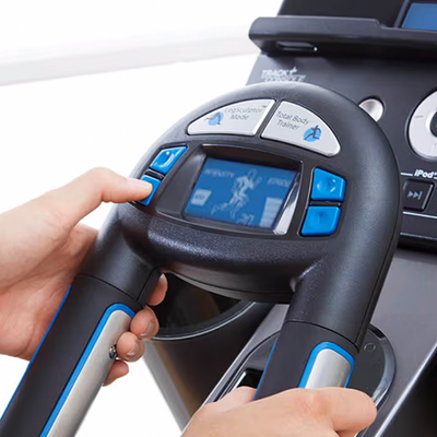 The Total Body Trainer Program will coach exercisers to train different muscle groups while the Leg Sculptor™ automatically adjusts stride length every two minutes for a targeted lower-body workout. An LCD screen shows muscles being worked.
