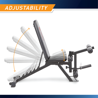 El ajuste de dientes de sierra le permite personalizar sus entrenamientos de acuerdo con su entrenamiento objetivo. Este banco versátil puede pasar de inclinado a plano y declinado.