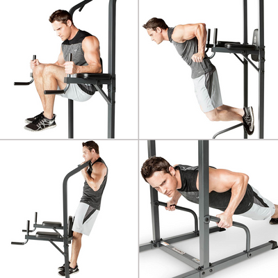 La Power Tower tiene múltiples estaciones que apuntan a diferentes áreas y músculos de su cuerpo. Una estación ergonómica vertical de elevación de rodillas ejercita tu núcleo, mientras que la estación de agarre y la barra de dominadas apuntan a tus músculos abdominales para un poderoso entrenamiento de la parte superior del cuerpo. La estación de flexiones también puede servir como escalón para otros ejercicios.