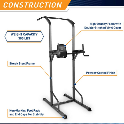 Esta torre de entrenamiento está construida con un marco de acero resistente con recubrimiento en polvo para un uso duradero, además cuenta con un respaldo acolchado y reposabrazos para su comodidad. Fortalece la parte superior del cuerpo, el core y la espalda. Estación de dominadas con agarre múltiple. Estación vertical para elevación de rodillas con reposabrazos acolchados de lujo y respaldo. Estación de flexiones integrada. La estación de fondos esculpe la parte superior del cuerpo. Diseño de estructura de acero resistente.
