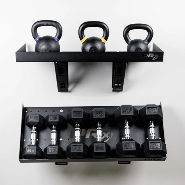 Space is precious and traditional dumbbell racks take up a lot of it. That's why we created the PRx Wall-Mount Dumbbell Storage! With its versatile mounting design, this storage shelf gets your hand-held weights off the ground and on to the wall with ease.