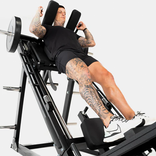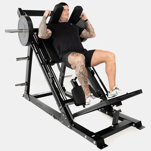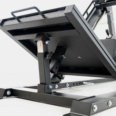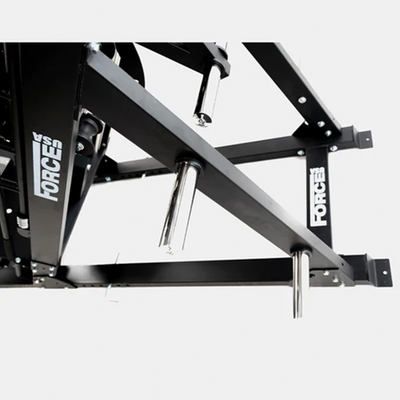 The latest Leg Press Squat Hack has the Force USA DNA all over it! This newly updated machine has a host of features including: • Longer and more ergonomic safety handle with moulded grips for greater exercise control • Weight plate loading sleeves designed with a curved centred section to accommodate the longer safety handles, which also strengthens the sleeves • The removable backrest has been redesigned to fit better and is easier to remove • The safety stopper has been redesigned to enable a deeper leg press and hack squat • The tread of the upper and lower foot plate has been changed to a more grippy material.